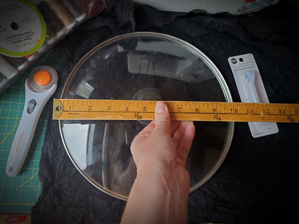 I found a tutorial and started with the information I found there. The instructions called for a 12″ diameter piece of fabric. I tried 10″ at 1st because that was the biggest pot lid I found. When I sewed up the snood it was huge! I will say that the post looked to be making a bun cover for an adult so that may account for some differences.