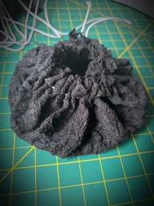 - I bunched up my snood to about 2 inches diameter and tied off my elastic with a square knot.
