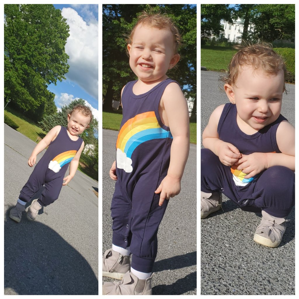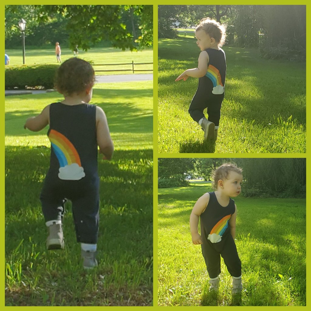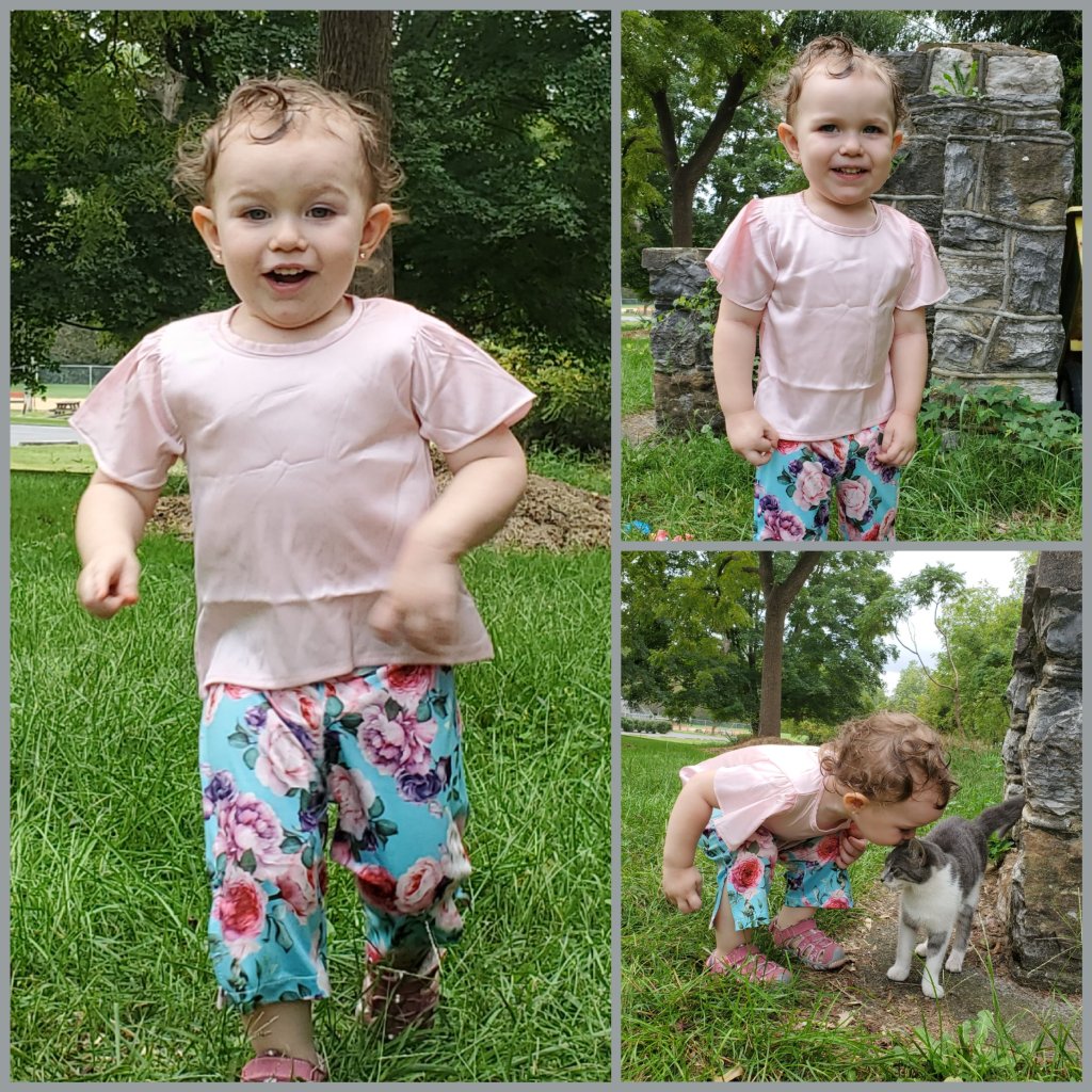 She wears this overall outfit all the time now, though the warm season is pretty much over so the shorts will be sent off to a cousin soon. This outfit is super cute and worth the price I paid. I couldn’t believe the white shirt made it through to the season’s end without being ruined!
