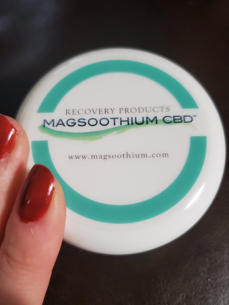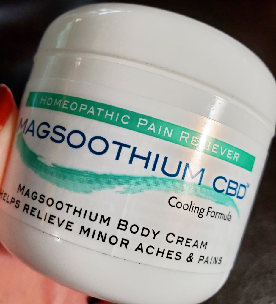 Magsoothium has magnesium, arnica, menthol, cacao, witch hazel, some other things, and THC-Free CBD oil.