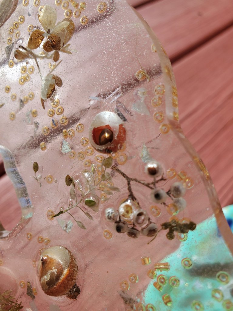 Unfortunately anything organic left exposed to the air tends to shrivel pretty quickly. I had a funny little seed that didn’t get fully coated and it’s shriveling inside of my resin project. If I had gotten to it with a clear coat of nail polish within a day or so I probably could have halted or at least slowed the shriveling process but I forgot. Oh well.