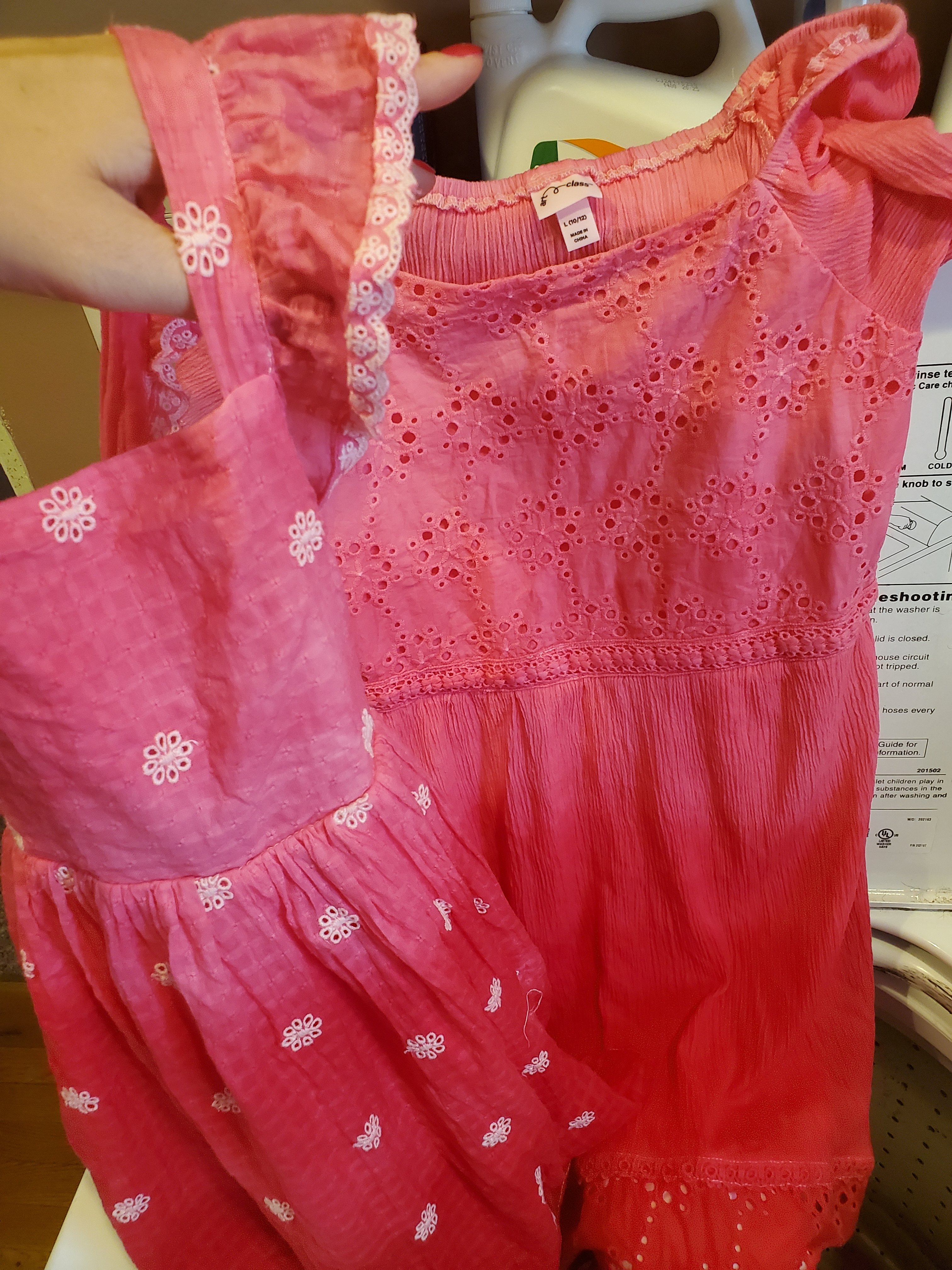The 1st time I washed these dresses with other clothes I used Color Catchers to absorb any extra color that might bleed out. Then I dried them in the dryer like normal. I haven’t used the color catchers since that 1st wash, but we wash most of our clothes on cold so no color has transferred to other items. The pink color has faded slightly over time but the dresses still look as beautiful as ever.