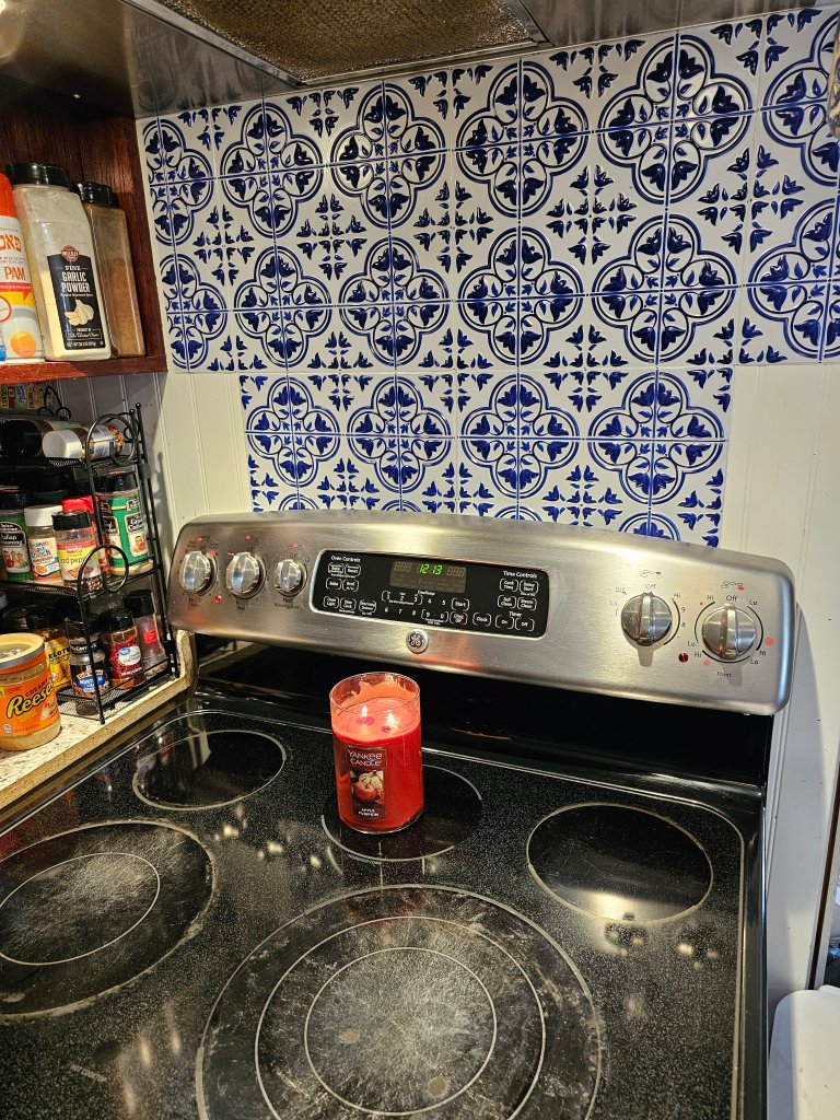 I also put Dollar Tree Blue and White Wall Tiles up on my backsplash. Billy teased me because he can do real tile work, but I love it, it protects my wall, and all without me having to pay for real tile or commit to a design.