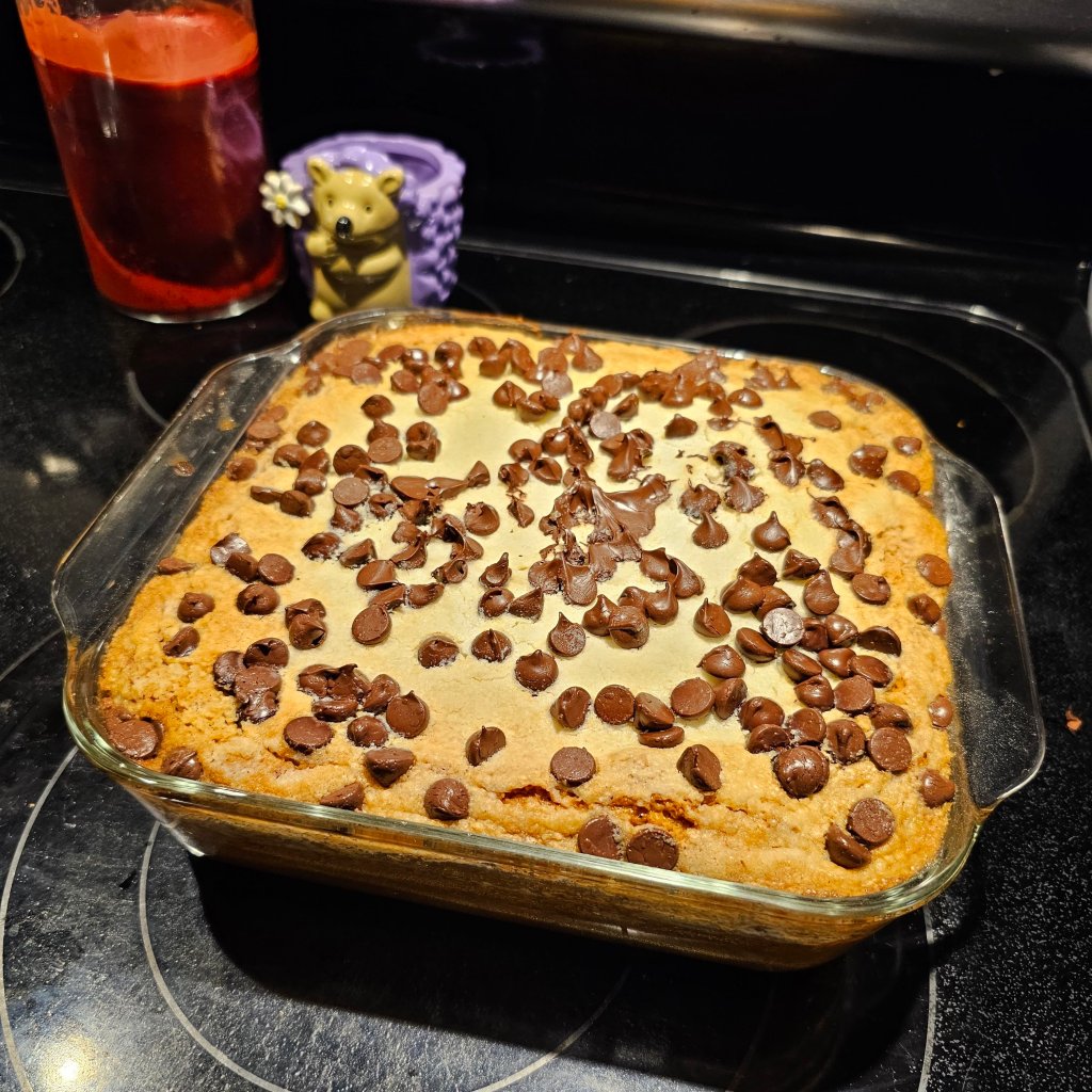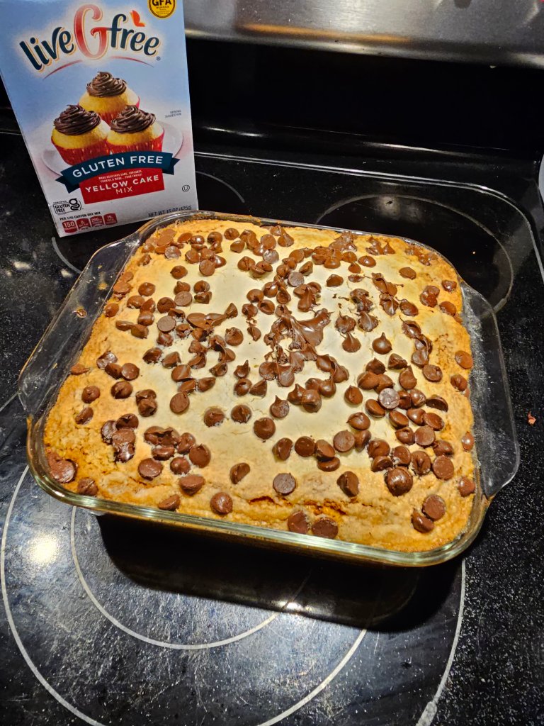 I bought an Aldi liveGfree GF yellow cake mix, and followed the recipe almost to a tee. We did mix the top layer with the butter even though it calls for just dumping it in.